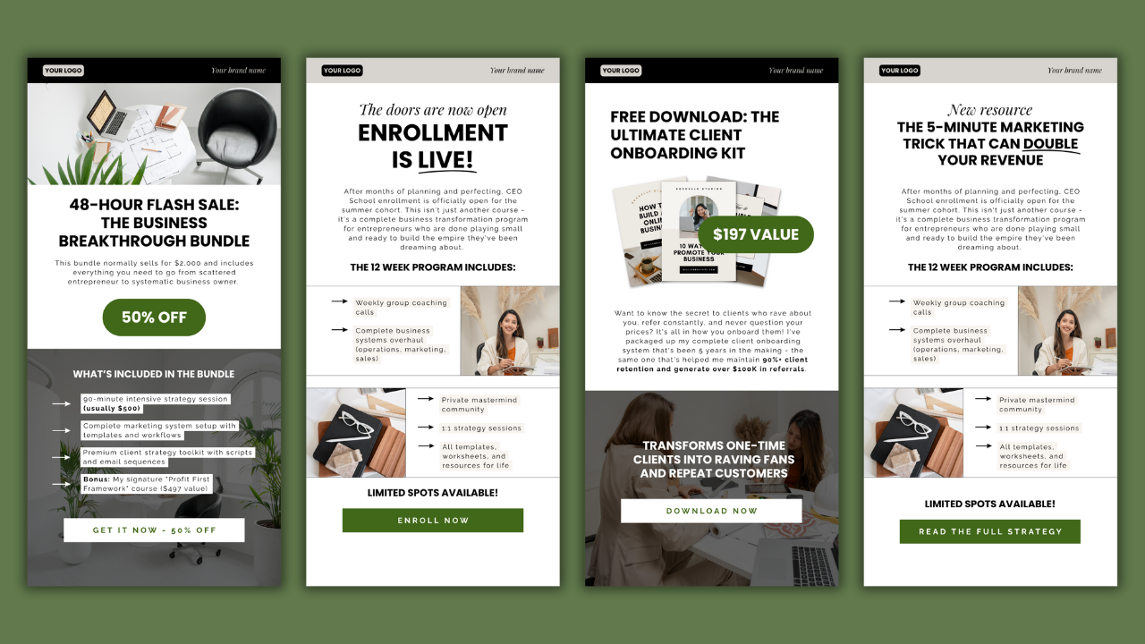 These service-based templates are included in your Email Clubhouse membership at no additional cost. Plus, we're adding fresh templates every month, so you'll never run out of ways to connect with your audience.