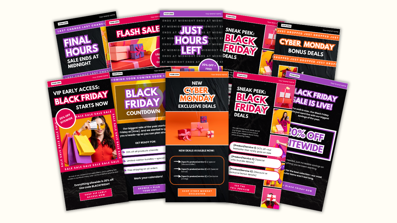 This isn't just a collection of designs. It's a complete, strategic email campaign plan with everything you need to maximize sales from pre-sale hype through final Cyber Monday hours.